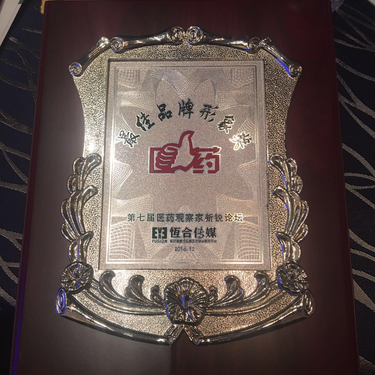 在12月1日,,,,,,昆明药交会前夕举行的第七届医药视察家新锐论坛上,,,,,,Pa旗舰厅官网药业再获佳绩,,,,,,依附优异的品牌文化和业界口碑,,,,,,荣获“最佳品牌形象奖”。。。。。。公司品牌治理部总监方康莉女士现场受领声誉奖牌。。。。。。