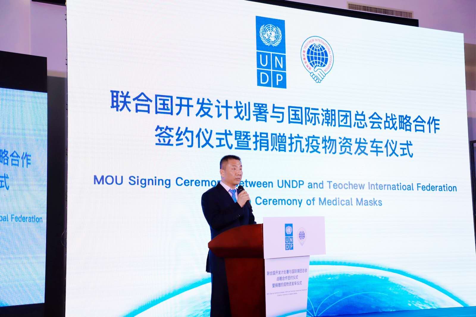 除捐赠抗疫物资发车仪式外 ,,,,,,运动中 ,,,,,,国际潮团总会主席洪江游、执行主席陈幼南博士代表国际潮团总会签署了与团结国开发妄想署的相助备忘录 ,,,,,,双朴直式建设战略相助同伴关系。。。。。。。