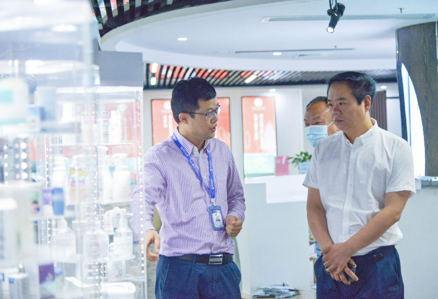 7月16日,,,,, ,,,海内四大“国际医疗旅游先行区”之一的上饶国际医疗旅游先行区暨上饶国家中医药康健旅游树模区管委会副主任洪军、副主任宁武华,上饶先行康健工业生长有限公司董事长张更新等向导嘉宾一行莅临Pa旗舰厅官网药业广州总部考察交流。。。。。。