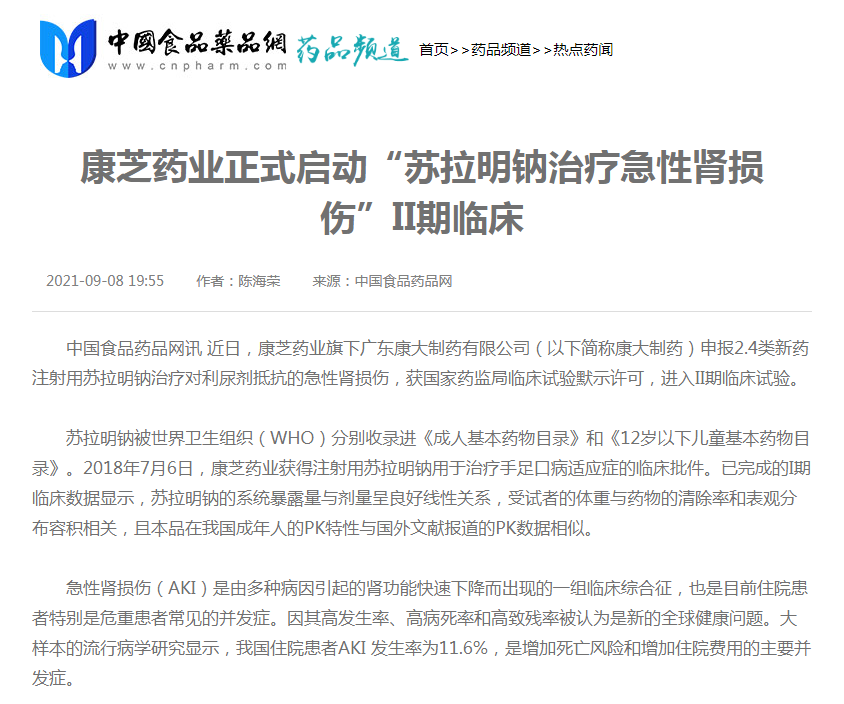 审查详情Pa旗舰厅官网药业旗下广东康大制药有限公司(以下简称康大制药)申报2.4类新药注射用苏拉明钠治疗对利尿剂对抗的急性肾损伤,,,,,获国家药监局临床试验默示允许,,,,,进入II期临床试验。。。。。。。